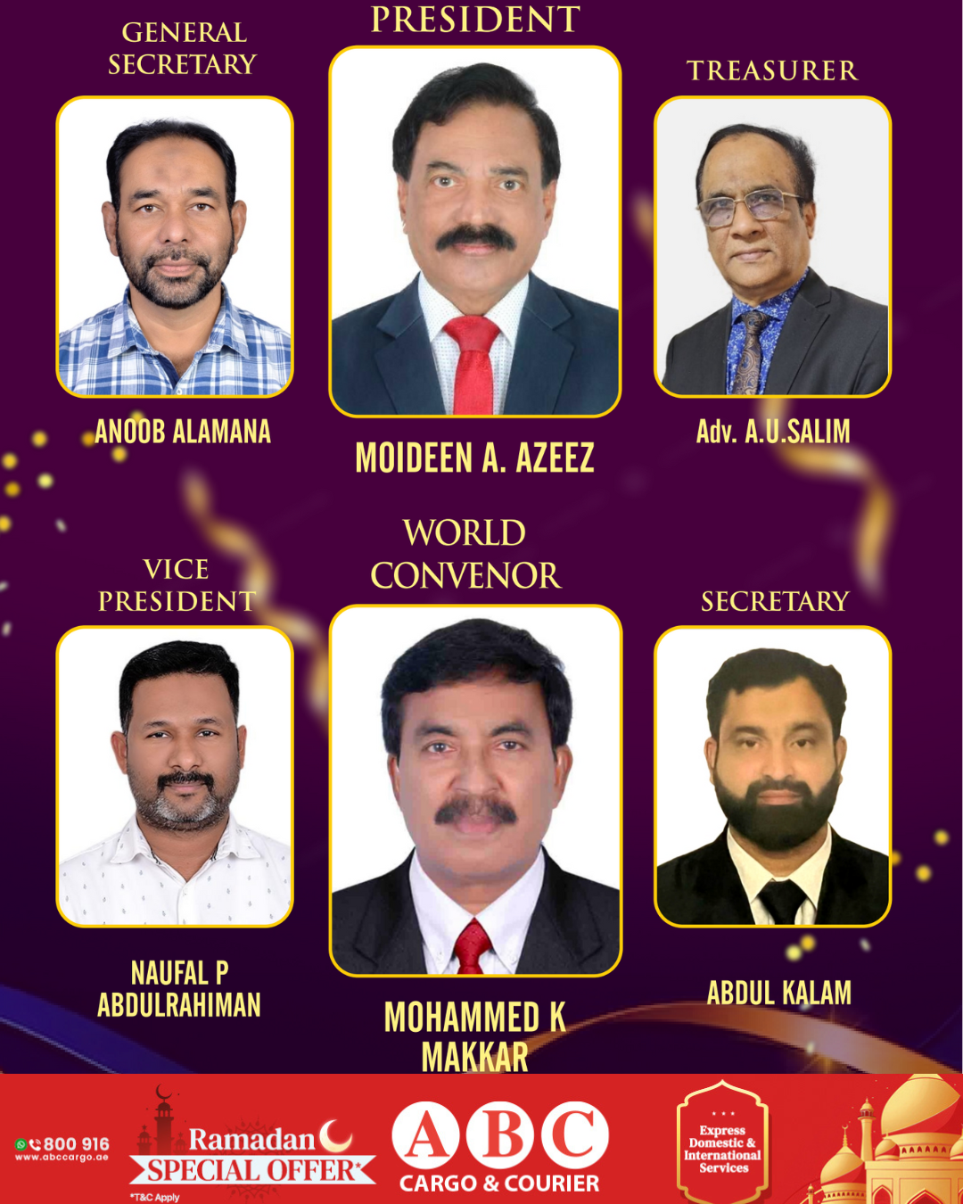 ദുബായ്: ആലുവ റെസിഡൻ്റ്സ് ഓവർസീസ് മലയാളിസ് അസോസിയേഷൻ (അരോമ) ദുബായിൽ വച്ച് നടന്ന ജനറൽ കൗൺസിലിൽ 2024-26 വർഷത്തേക്കുള്ള ഭാരവാഹികളെ തിരഞ്ഞെടുത്തു. മൊയ്തീൻ അബ്ദുൽ അസീസ് (പ്രസിഡൻ്റ്), നൗഫൽ റഹ്മാൻ (വൈ:പ്രസിഡൻ്റ്), അനൂബ് എളമന (ജനറൽസെക്രട്ടറി), അബ്ദുൽ കലാം (സെക്രട്ടറി), അഡ്വ: സലീം എ.യു (ട്രഷറർ) മുഹമ്മദ് കെ മക്കാർ (വേൾഡ് അരോമ കൺവീനർ) സുനിതാ ഉമ്മർ (വെൽഫെയർ) സനുഖാൻ (സ്പോർട്ട്സ് & ആർട്ട്സ്) അൻവർ കെ.എം (മീഡിയ) എക്സിക്യൂട്ടീവ് അംഗങ്ങൾ സിദ്ധിഖ് മുഹമ്മദ്, നാദിർഷാ അലി അക്ബർ, ലൈജു കാരോത്തു കുഴി, ഷിഹാബ് മുഹമ്മദ്, ഉമ്മർ, ബിനോഷ് ബാലകൃഷ്ണൻ, സക്കീർ എം, നിയാസ് ഉസ്മാൻ, മൻസൂർ എന്നിവരെ തെരഞ്ഞെടുത്തു. അഡ്വ: നജ്മുദീൻ തെരഞ്ഞെടുപ്പ് നിയന്ത്രിച്ചു. സിദ്ധിഖ് മുഹമ്മദ്, നാദിർഷാ അലി അക്ബർ, ലൈജു കാരോത്തുകുഴി, അരോമ അബുദാബി പ്രസിഡൻ്റ് അബ്ദുൽ ജലീൽ പി എ, ഷിഹാബ്, അരോമ ദുബായ് പ്രസിഡൻ്റ് വഹീദ്, ഷാർജ പ്രസിഡൻ്റ് അബ്ദുൽ റഷീദ്,അജ്മാൻ പ്രസിഡൻ്റ് ഷുഹൈബ്,റാസൽ ഖൈമ പ്രസിഡൻ്റ് നവാസ് ഇലഞ്ഞിക്കായി,ഫുജൈറ പ്രസിഡൻ്റ് ഷജറഞ്ഞ്, ഉമ്മുൽ ഖുവൈൻ പ്രസിഡൻ്റ് ഫൈസൽ എളമന അരോമൽ പ്രസിഡൻ്റ് അഡ്വ: ഫെബി ഷിഹാബ് മുൻ മീഡിയ കൺവീനർ സബാഹ് തുടങ്ങിയവർ ആശംസകൾ നേർന്നു. അനുബ് എളമന സ്വാഗതവും, മൊയ്തീൻ അബ്ദുൽ അസീസ് നന്ദിയും പറഞ്ഞു.