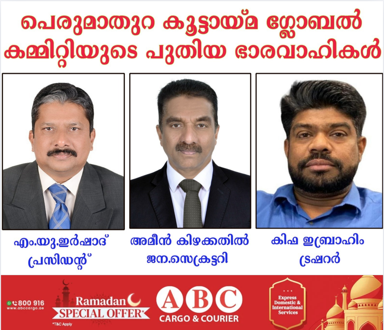 അബുദാബി : ജിസിസി രാജ്യങ്ങൾ കേന്ദ്രമാക്കി പ്രവർത്തിക്കുന്ന പെരുമാതുറ കൂട്ടായ്മയുടെ 2025-26 ലേക്കുള്ള പുതിയ ഭാരവാഹികളെ തിരഞ്ഞെടുത്തു. പ്രസിഡന്റ് നജീബ് അബ്ദുൽ ഖാദറിന്റെ അധ്യക്ഷതയിൽ ചേർന്ന വാർഷിക ജനറൽ ബോഡിയിൽ, ജനറൽ സെക്രട്ടറി കിഫാ ഇബ്രാഹിം വാർഷിക റിപ്പോർട്ടും ട്രഷറർ അൻസാർ ഖമറുദ്ദീൻ വരവ് ചെലവ് കണക്കും അവതരിപ്പിച്ചു. 25 വർഷമായി ജീവകാരുണ്യ രംഗത്ത് സ്തുത്യർഹമായ സേവനങ്ങൾ നടത്തിവരുന്ന പെരുമാതുറ കൂട്ടായ്മ, നാട്ടിലെ ജീവകാരുണ്യ വിദ്യാഭ്യാസ രംഗങ്ങളിൽ ഒട്ടേറെ നവീന പദ്ധതികൾ കഴിഞ്ഞ കാൽ നൂറ്റാണ്ടായി ആവിഷ്കരിച്ച് നടപ്പിലാക്കിവരുന്നു . ജിസിസി രാജ്യങ്ങളിളെല്ലാം യൂണിറ്റുകളുള്ള സംഘടനക്ക് ഇംഗ്ലണ്ടിൽ പുതിയൊരു ഘടകം കുടി രൂപീകരിച്ചതിന് ശേഷമാണ് സംഘടന “പെരുമാതുറ കൂട്ടായ്മ ഗ്ലോബൽ’ എന്ന് പുനർ നാമകരണം ചെയ്തത്. പുതിയ ഭാരവാഹികളായി എം.യു .ഇർഷാദ്, പ്രസിഡന്റ് (യു.എ .ഇ ), അമീൻ കിഴക്കതിൽ, ജനറൽ സെക്രട്ടറി (കെ.എസ് .എ ), കിഫാ ഇബ്രാഹിം, ട്രഷറർ (യു.എ.ഇ) എന്നിവരെയും , വിവിധ രാജ്യങ്ങളിൽ നിന്നുള്ള 13 എക്സിക്യുട്ടീവ് അംഗങ്ങളെയും തിരഞ്ഞെടുത്തു. മുഹമ്മദ് ഹുമയൂൺ തിരഞ്ഞെടുപ്പ് നടപടിക്രമങ്ങൾ നിയന്ത്രിച്ചു.