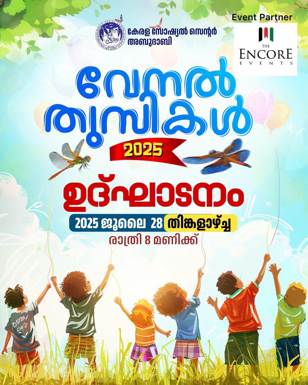 അബുദാബി: അബുദാബി കേരള സോഷ്യൽ സെന്റർ സംഘടിപ്പിക്കുന്ന സമ്മർ ക്യാമ്പ് ‘വേനൽ തുമ്പികൾ 2025’ ന്റെ ഉദ്ഘാടനം ഇന്ന് ജൂലൈ 28 (തിങ്കളാഴ്ച) നടക്കും. രാത്രി എട്ട് മണിക്ക് സെന്റർ മിനി ഹാളിൽ ആണ് ഉത്ഘാടനം നടക്കുക. നാട്ടിൽ നിന്നും എത്തിയ അധ്യാപകൻ അഡ്വ: പ്രദീപ് പാണ്ടനാടും, കേരളത്തിന്റെ AI അത്ഭുത ബാലൻ എന്നറിയപ്പെടുന്ന റൗൾ ജോൺ അജുവും ചേർന്നാണ് ഈ വർഷത്തെ ക്യാമ്പ് നയിക്കുന്നത്. ജൂലൈ 28 മുതൽ ഓഗസ്റ്റ് 17 വരെ ശനി ഞായർ ഒഴികെയുള്ള ദിനങ്ങളിൽ രാത്രി ആറു മണിമുതൽ ഒൻപത് മണിവരെയാണ് ക്യാമ്പ് നടക്കുക.