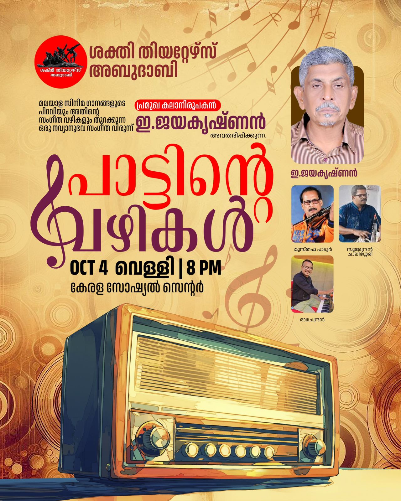 അബുദാബി ശക്തി തീയറ്റേഴ്സ് ഒരുക്കുന്ന ”പാട്ടിന്റെ വഴികൾ” ഇന്ന് അരങ്ങേറും