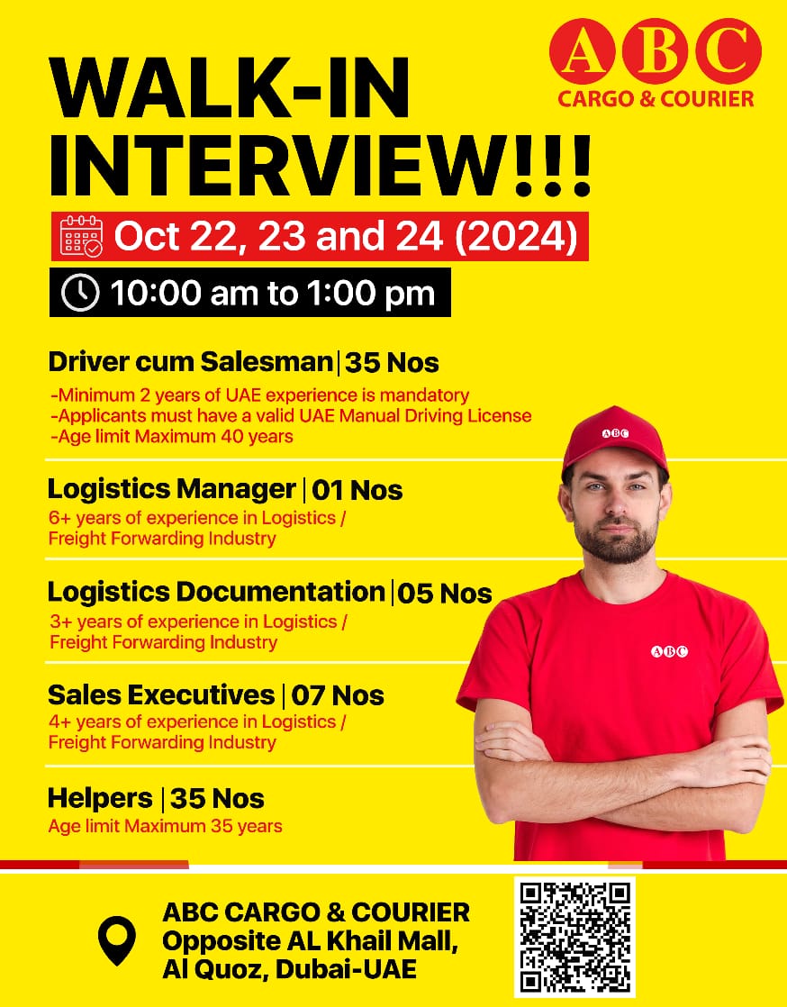 ലോജിസ്റ്റിക്ക്സ് മാനേജർ പോസ്റ്റിലേക്ക് ഒരു അവസരമാണ് ഉളളത്. ലോജിസ്റ്റിക്ക്സിലോ ഫ്രയ്റ്റ് ഫോർവാർഡ് ഇൻഡസ്റ്ററിയിലോ ആറ് വർഷത്തെ പ്രവർത്തി പരിചയം നിർബന്ധമാണ്. ലോജിസ്റ്റിക്ക്സ് ഡോക്യുമെന്റേഷനിലേക്ക് അഞ്ച് തൊഴിൽ അവസരങ്ങളുമുണ്ട് ലോജിസ്റ്റിക്ക്സിലോ ഫ്രയ്റ്റ് ഫോർവാർഡ് ഇൻഡസ്റ്ററിയിലോ മൂന്ന് വർഷത്തെ പ്രവർത്തി പരിചയം വേണം.അത് പോലെ സെയിൽ എക്സിക്യൂടീവ് പോസ്റ്റിലേക്ക് അപേക്ഷിക്കുന്നവർക്ക് ലോജിസ്റ്റിക്ക്സിലോ ഫ്രയ്റ്റ് ഫോർവാർഡ് ഇൻഡസ്റ്ററിയിലോ നാല് വർഷത്തെ പ്രവർത്തി പരിചയം ആവശ്യമാണ്. 35 ഹെൽപേർസ് പോസ്റ്റിലേക്കും അവസരമുണ്ട് അപേക്ഷിക്കുന്നവർക്ക് 35 വയസ് കവിയരുത്. ദുബായിലെ എബിസി കാർഗോ കോർപ്പറേറ്റ് ഹെഡ് ഓഫീസിൽ വച്ചു രാവിലെ 10 മണിമുതൽ ഉച്ചയ്ക്ക് 1 മണിവരെയാണ് ഇന്റർവ്യൂ നടക്കുക.