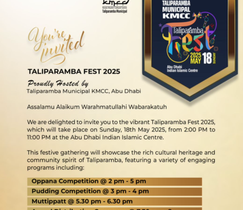 അബുദാബി: അബുദാബി തളിപ്പറമ്പ മുനിസിപ്പൽ കെ.എം.സി.സി സംഘടിപ്പിക്കുന്ന തളിപ്പറമ്പ